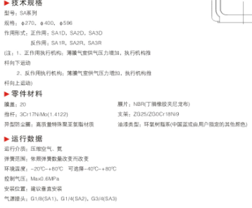 SA系列多弹簧气动薄膜执行机构,结构坚固紧凑、新颖美观、性能卓越。高强度的膜片可承受Max0.6MPa的供气压力,使执行机构输出力强劲,从而保证控制阀整机运行平稳、关闭严密。另外,执行机构具有极高的通用性及互换性,在现砀只要将膜头翻转,就能很轻松地变换作用形式。